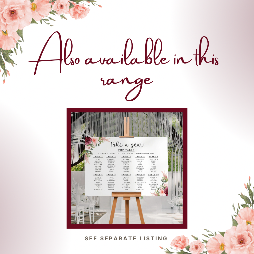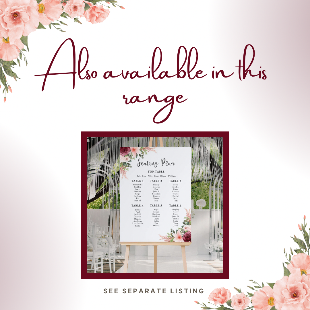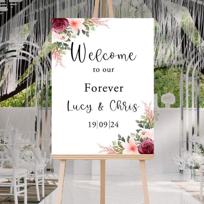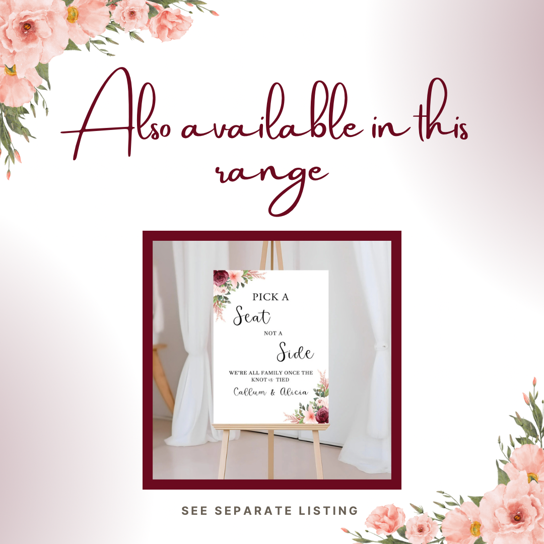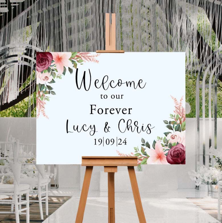 Featuring stunning burgundy and peach flowers, and a choice of landscape or portrait style, this sign will add a touch of beauty to your special day.
