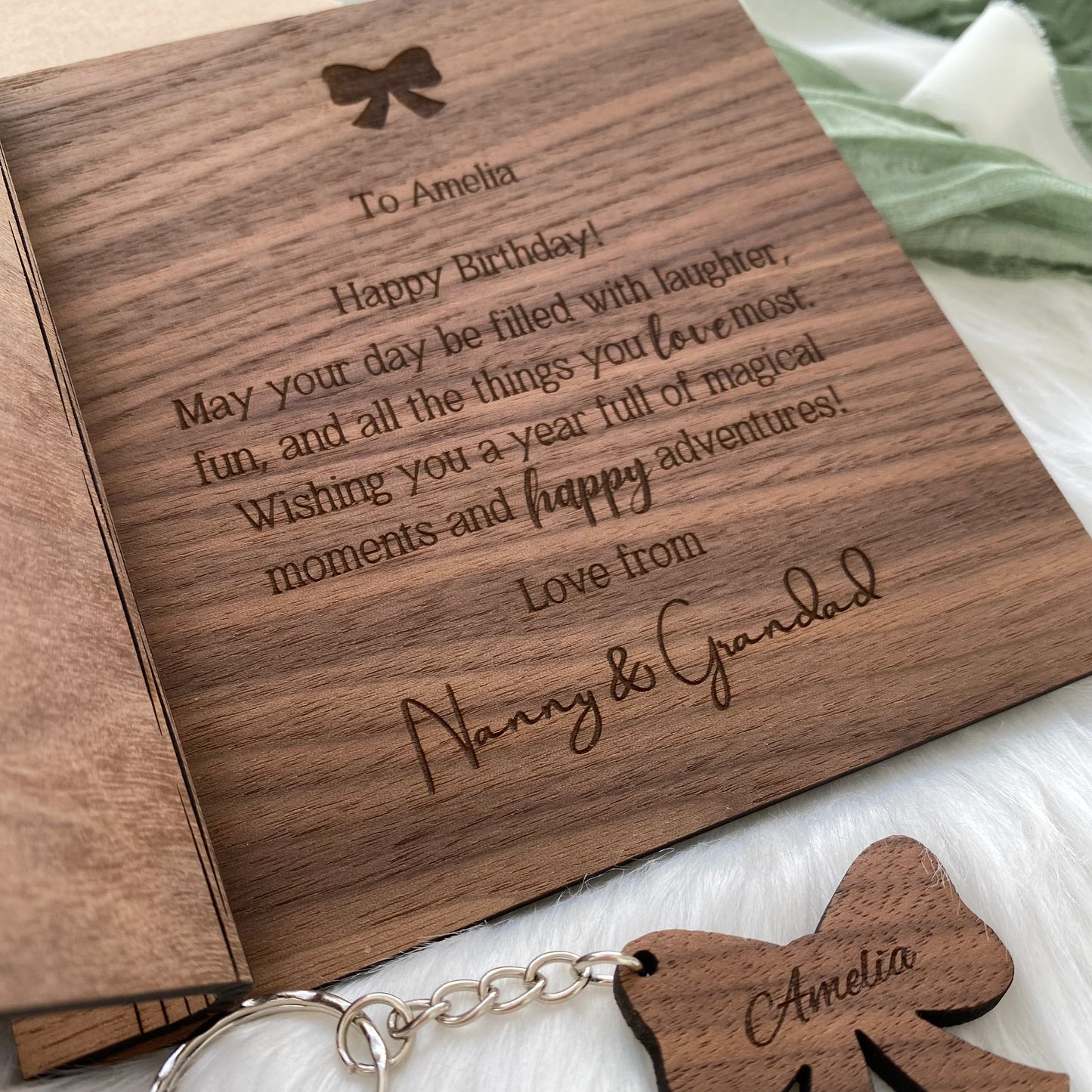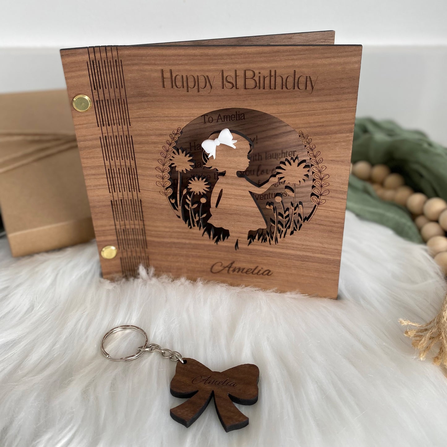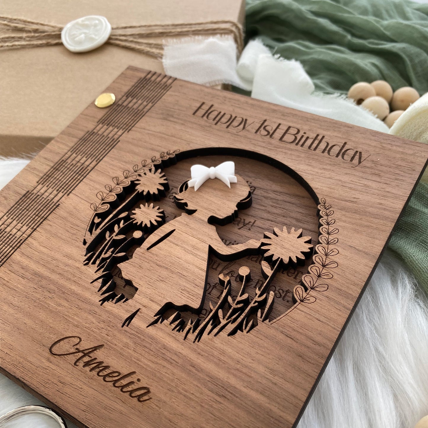 Celebrate a little girl's special day with our personalised wooden birthday card - a unique keepsake designed to be treasured forever.
