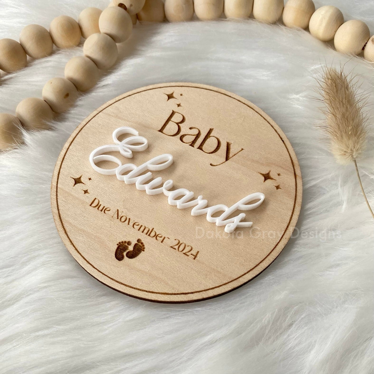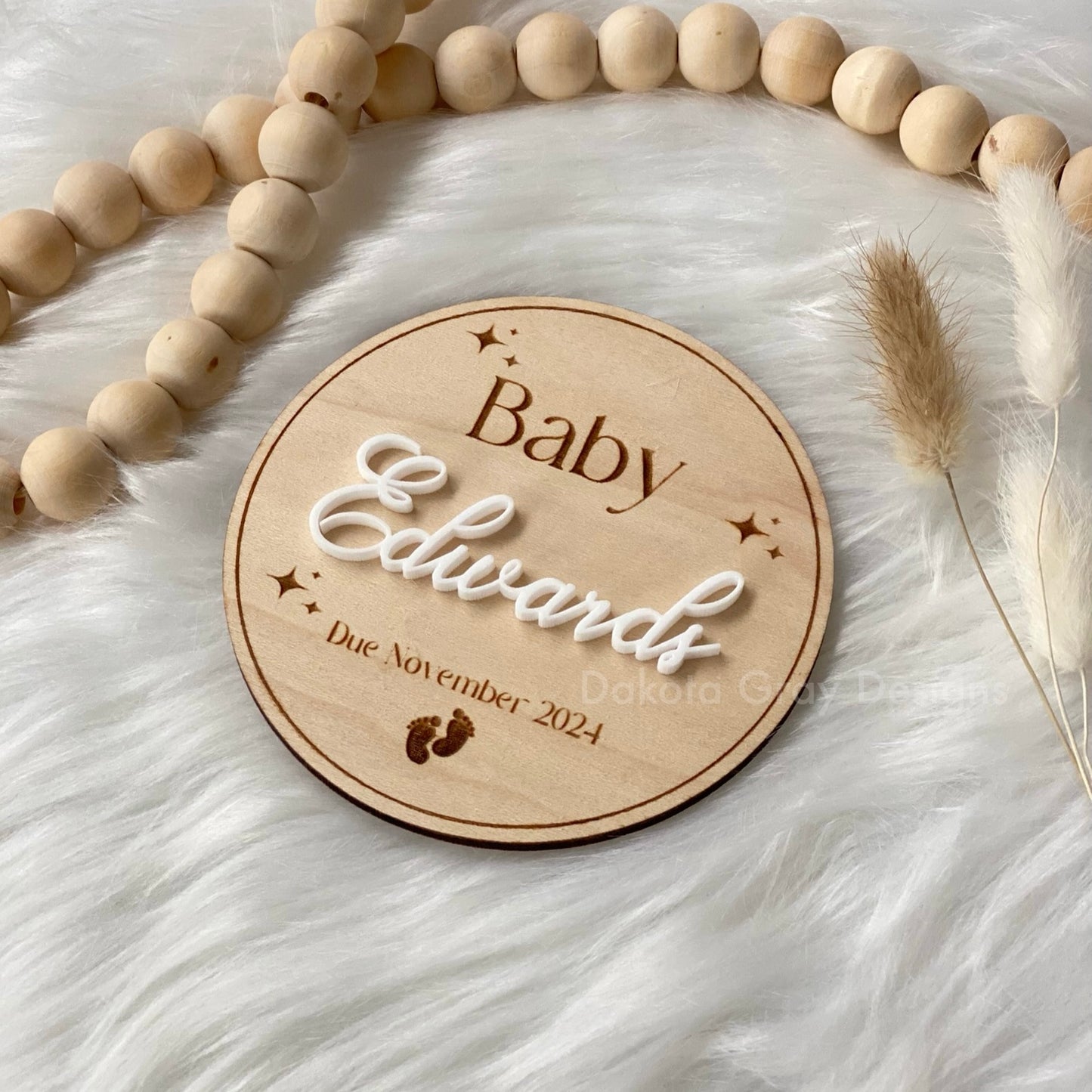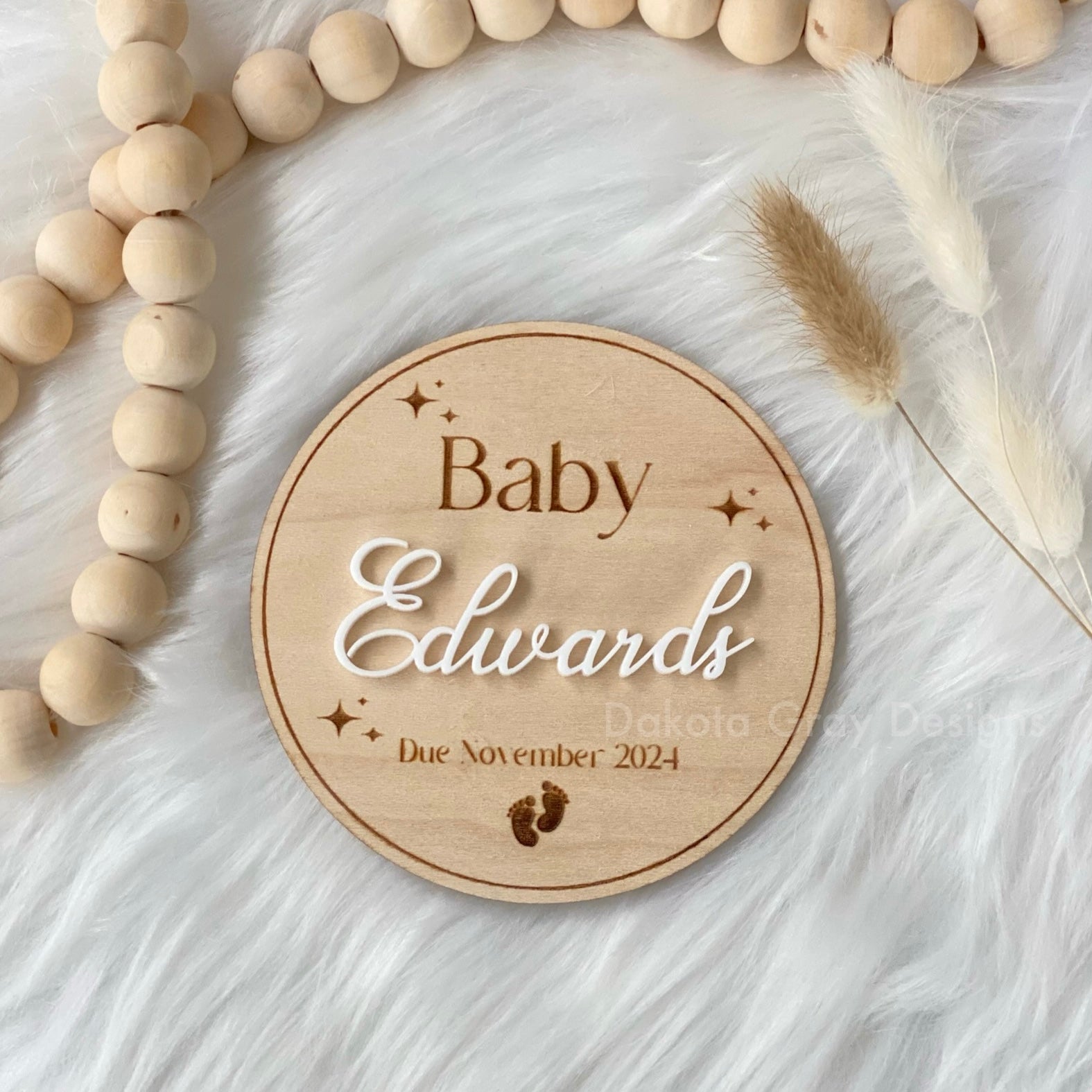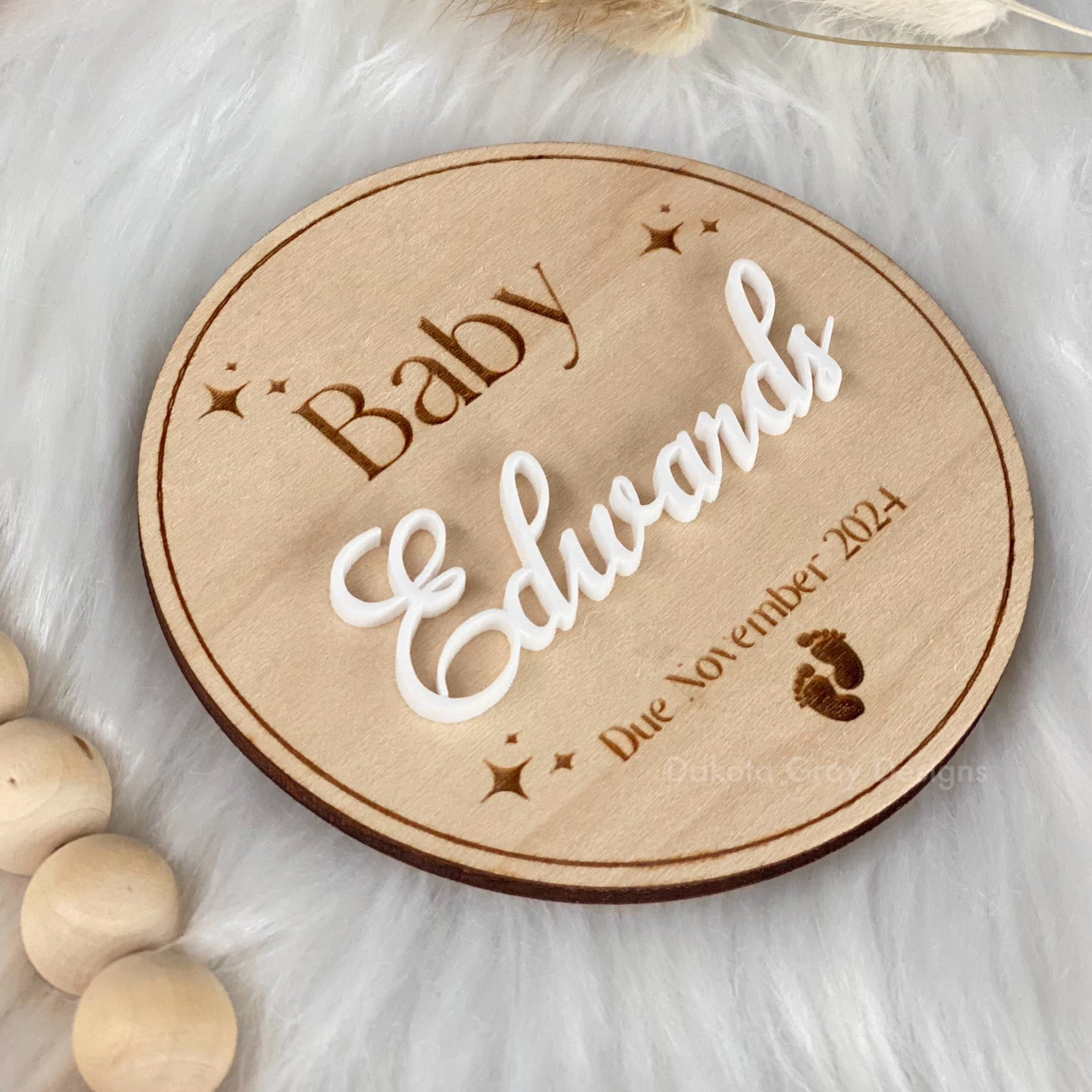 Crafted from 4mm maple plywood, this 10cm plaque is perfect for social media photos. Add a touch of personalisation with your surname in acrylic to this beautiful keepsake and your expected due date will be carefully engraved.