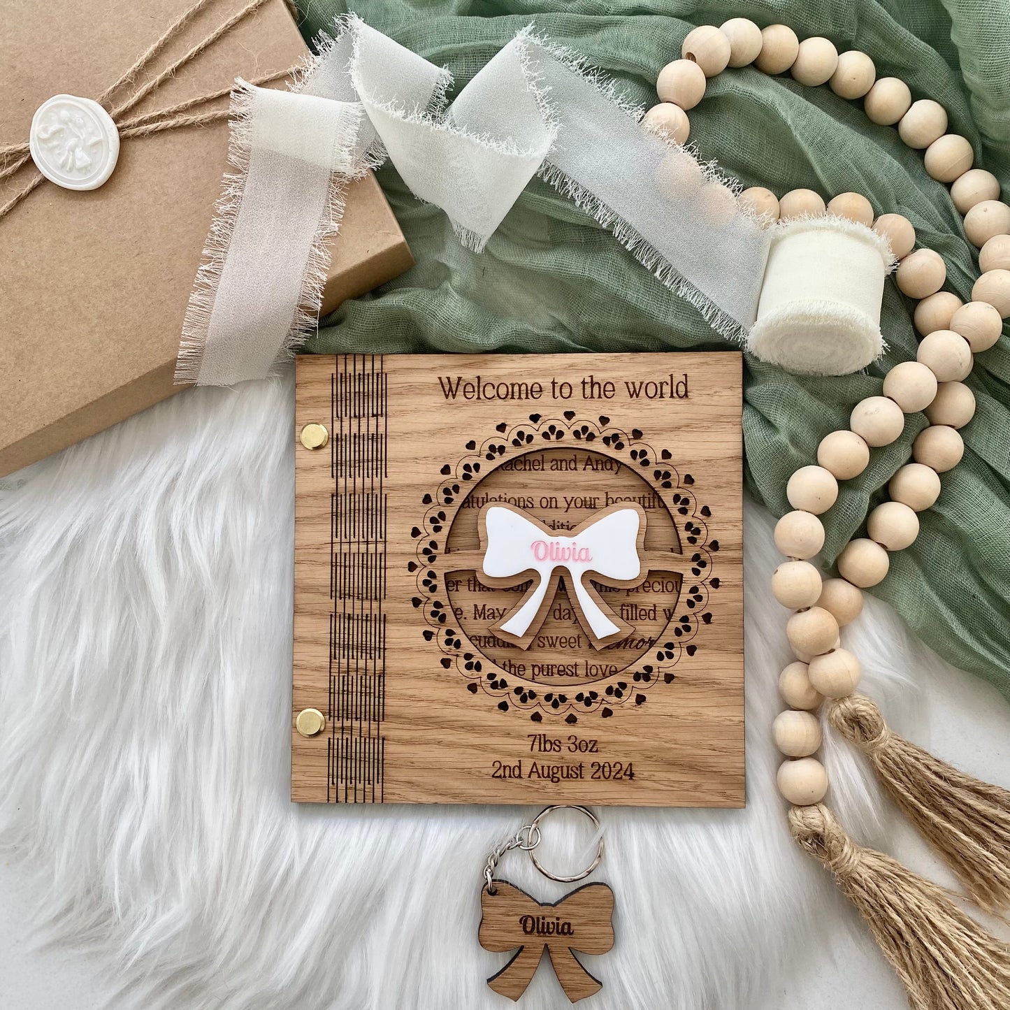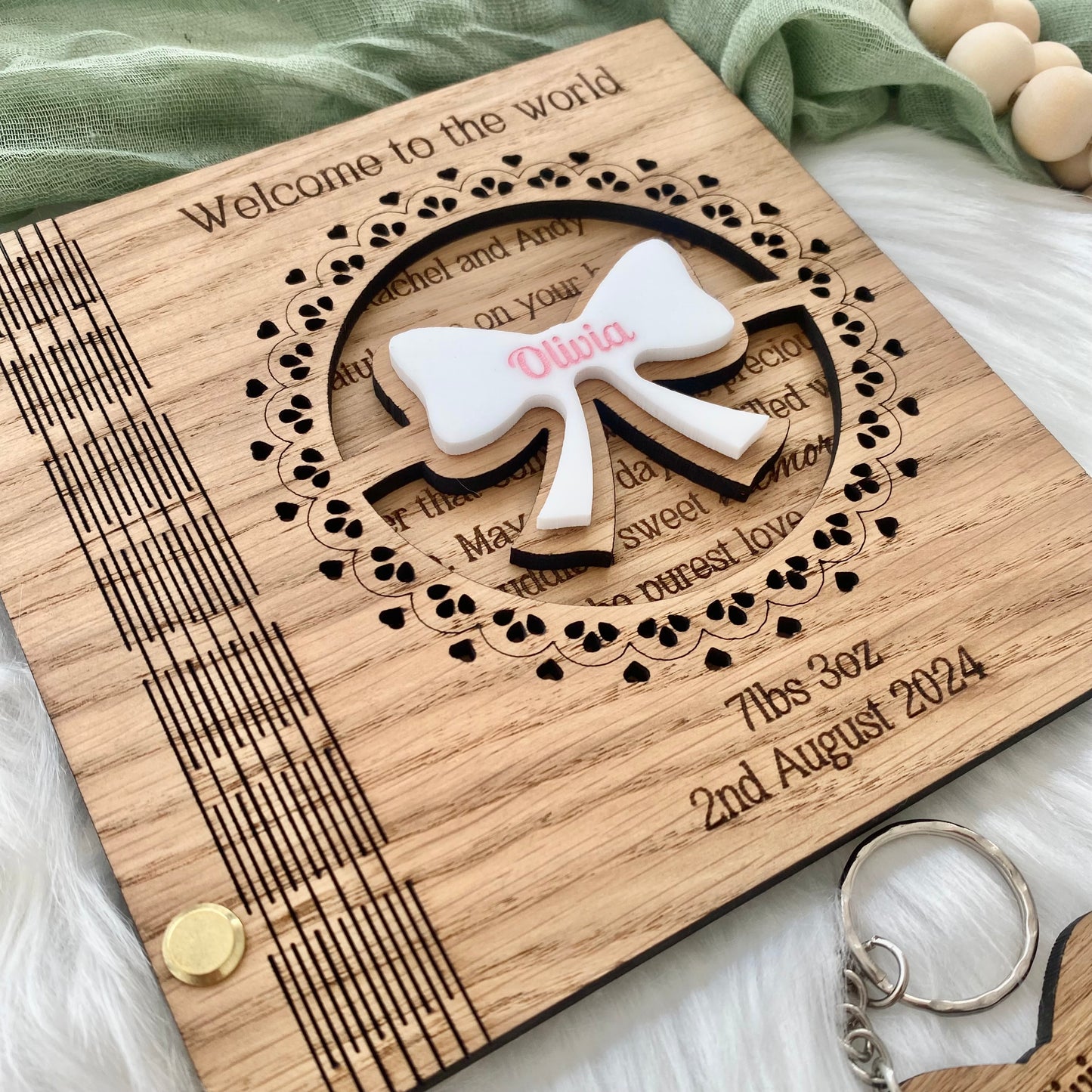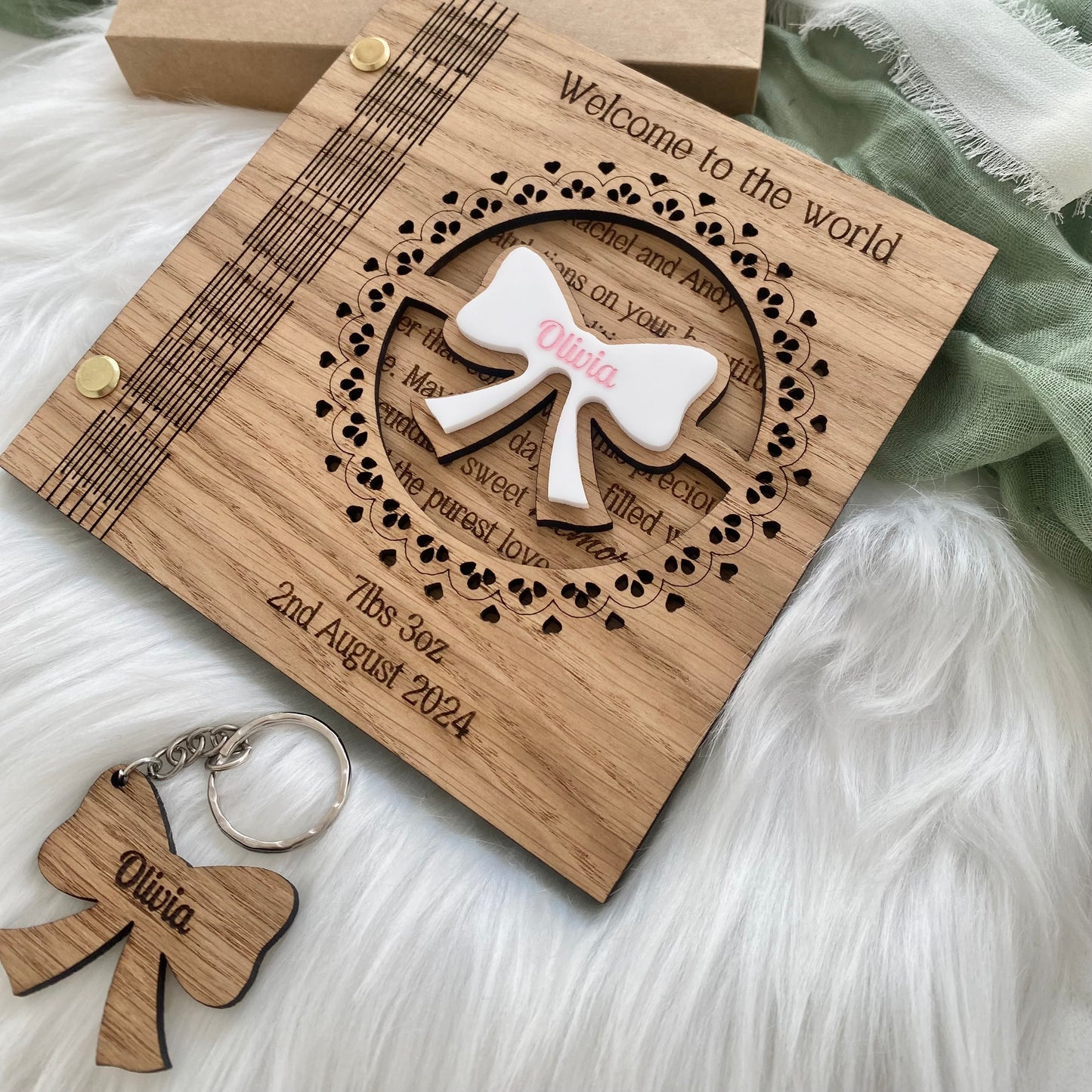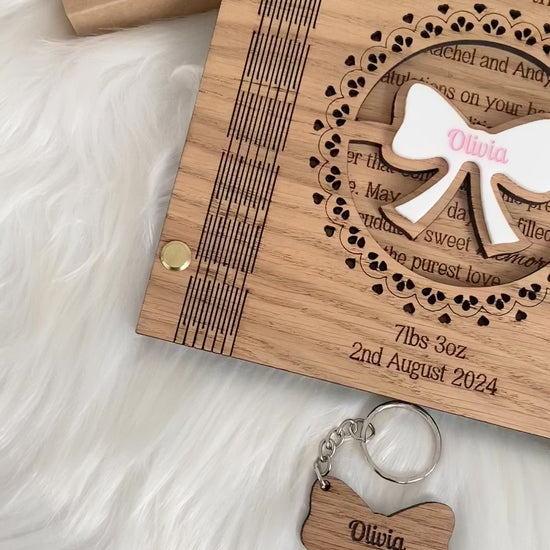 - Personalised Engravings: The baby's name on the acrylic bow and the date of birth and weight on the card, creating a bespoke keepsake.