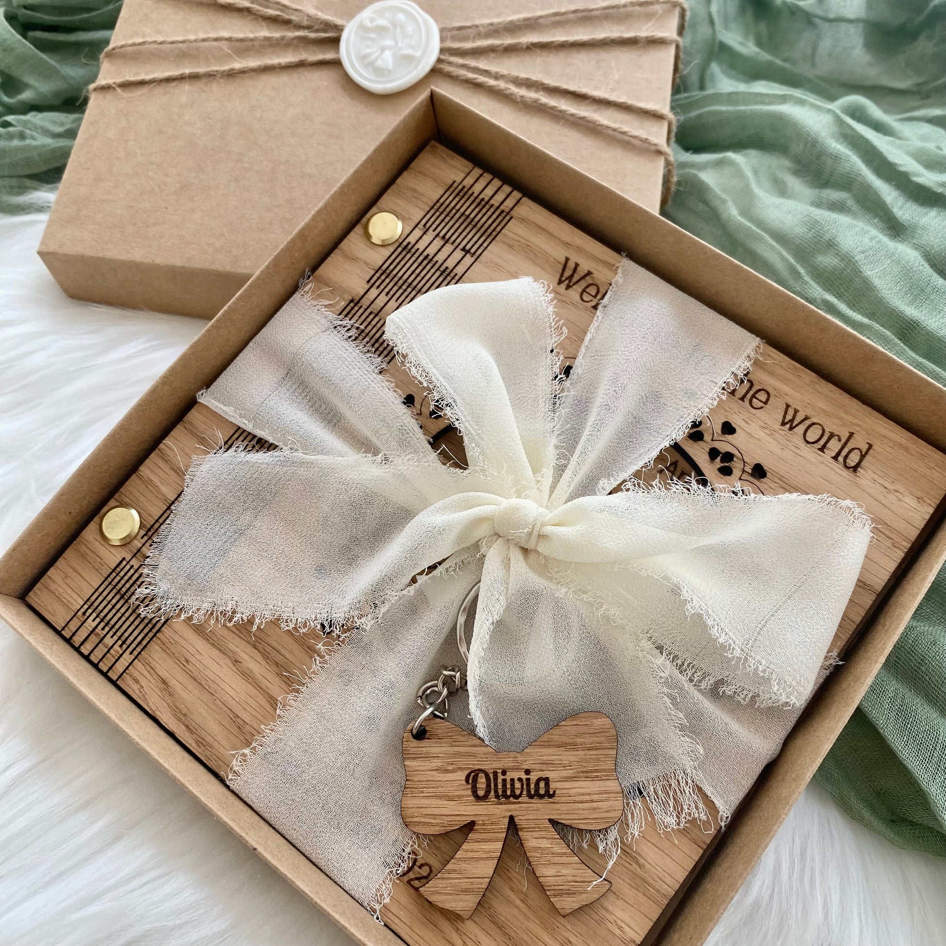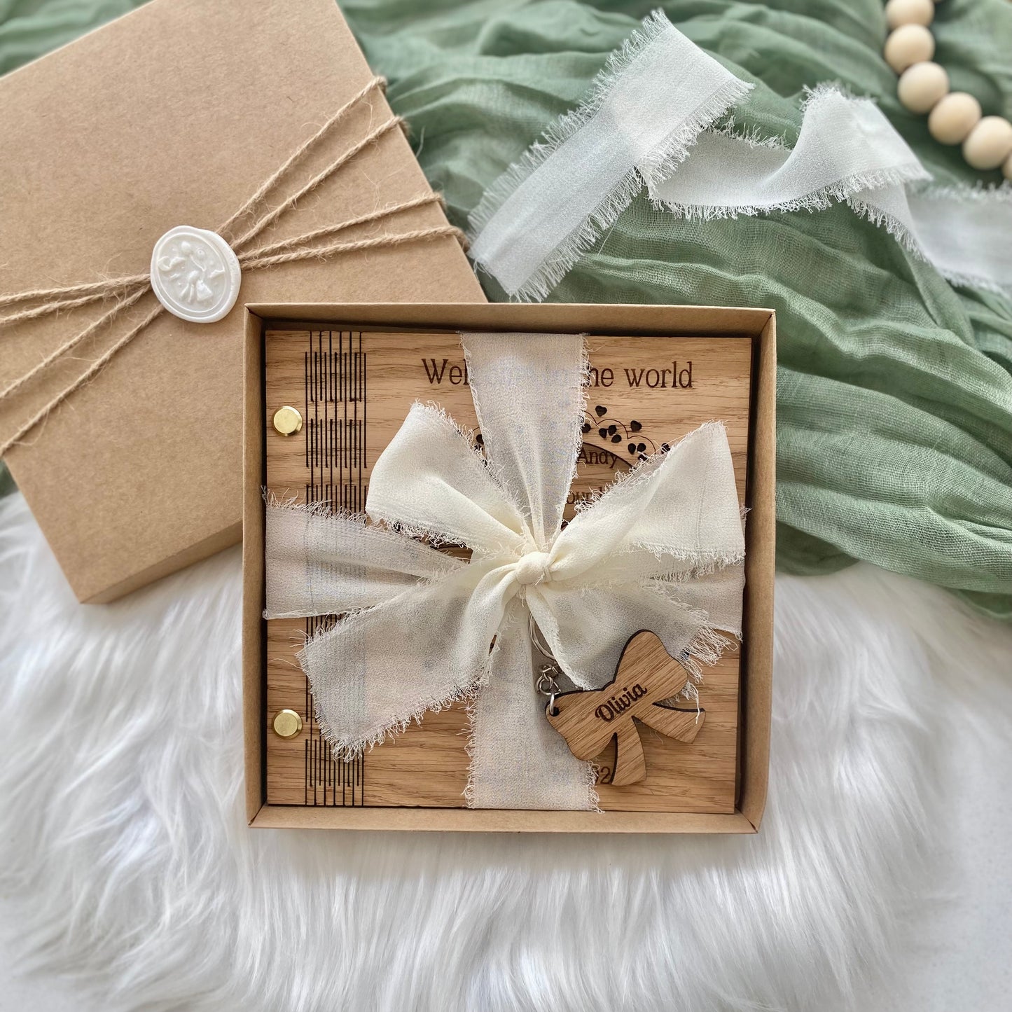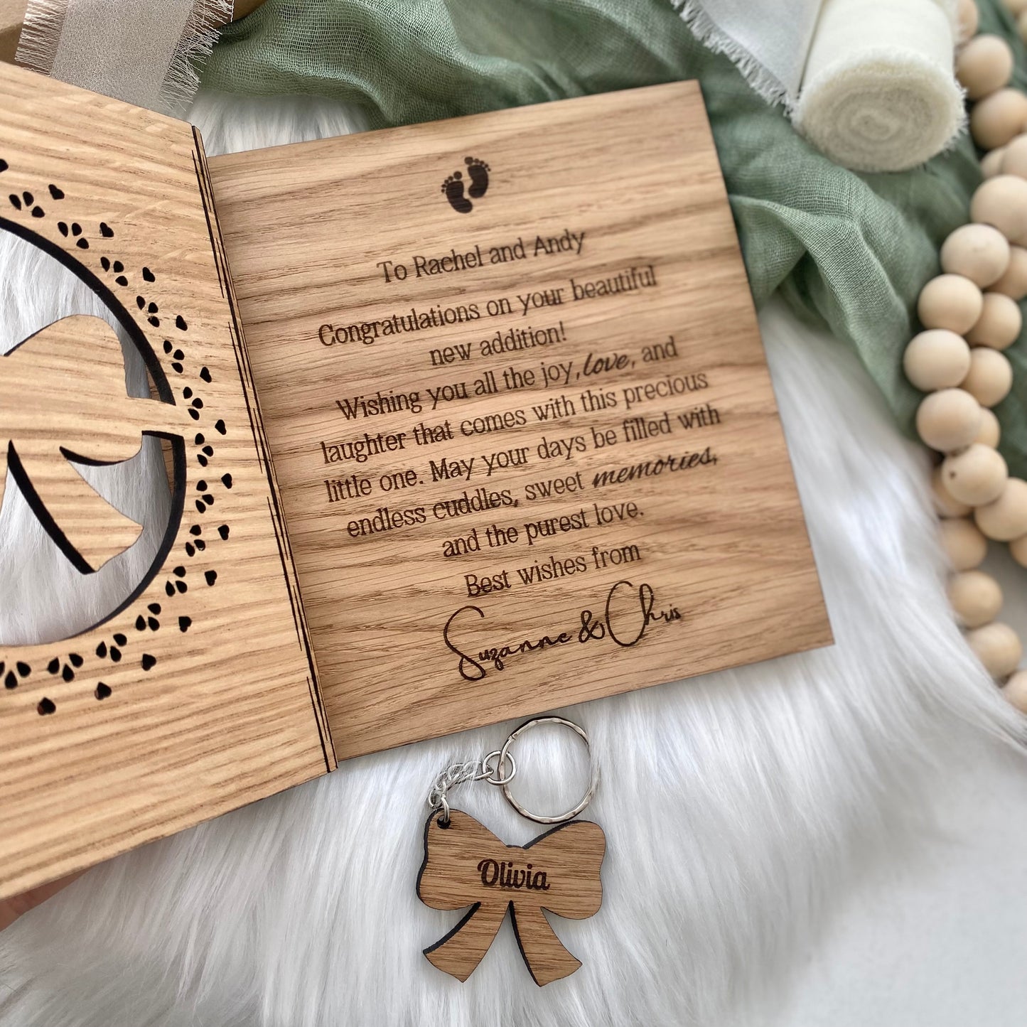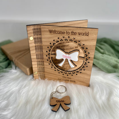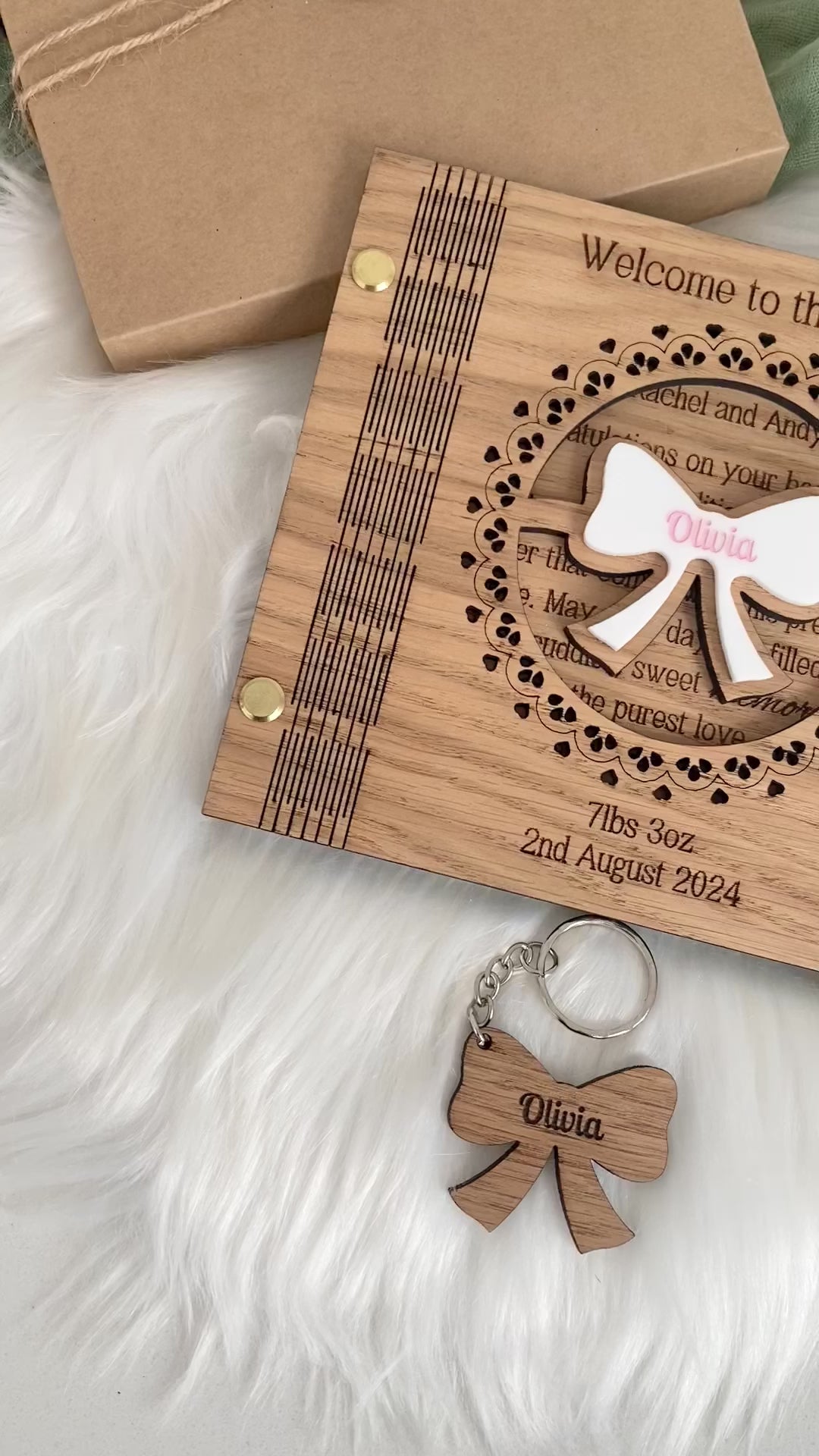 - Personalised Engravings: The baby's name on the acrylic bow and the date of birth and weight on the card, creating a bespoke keepsake.