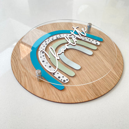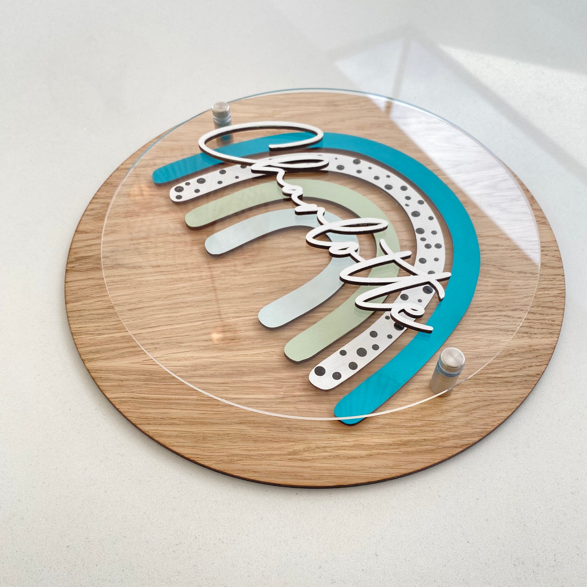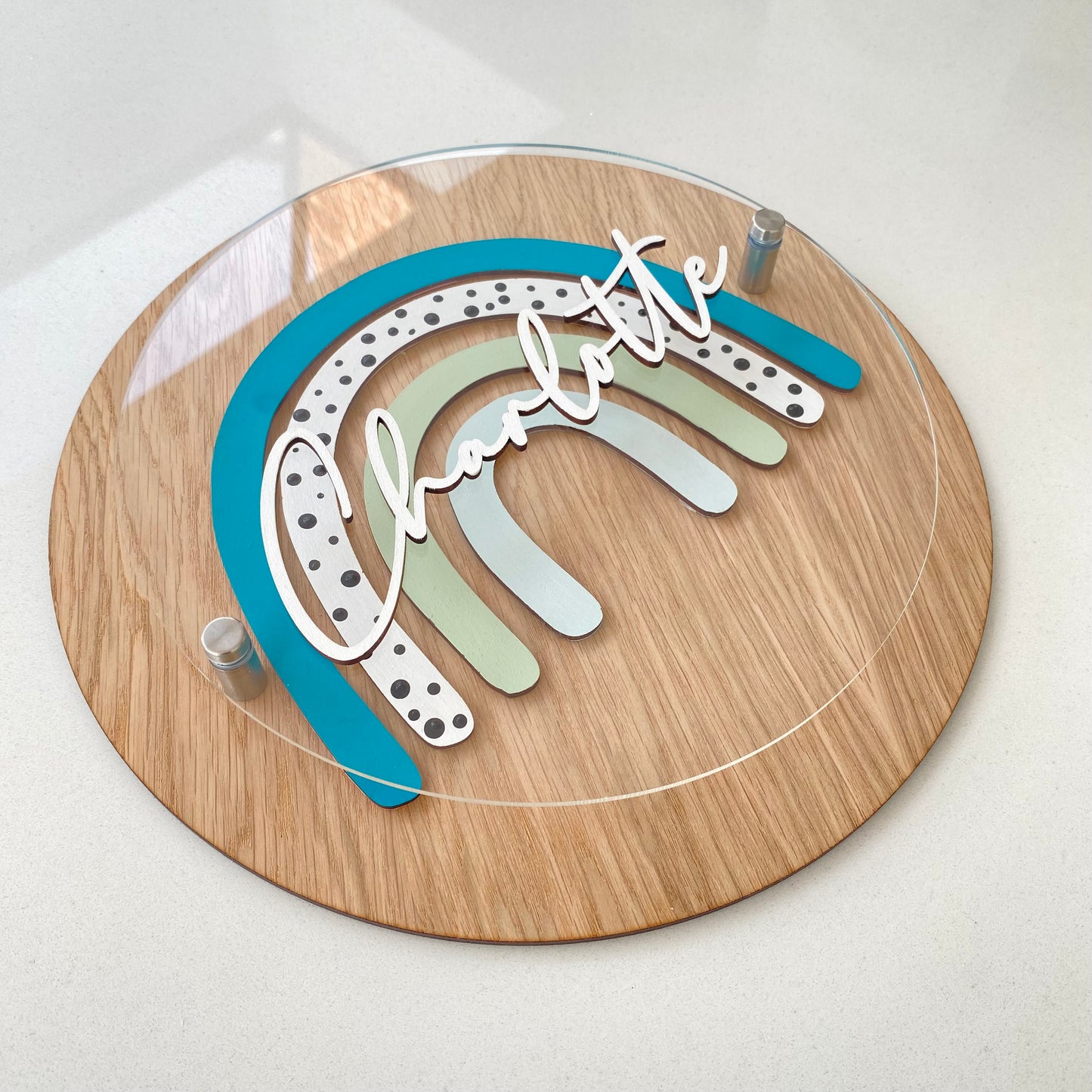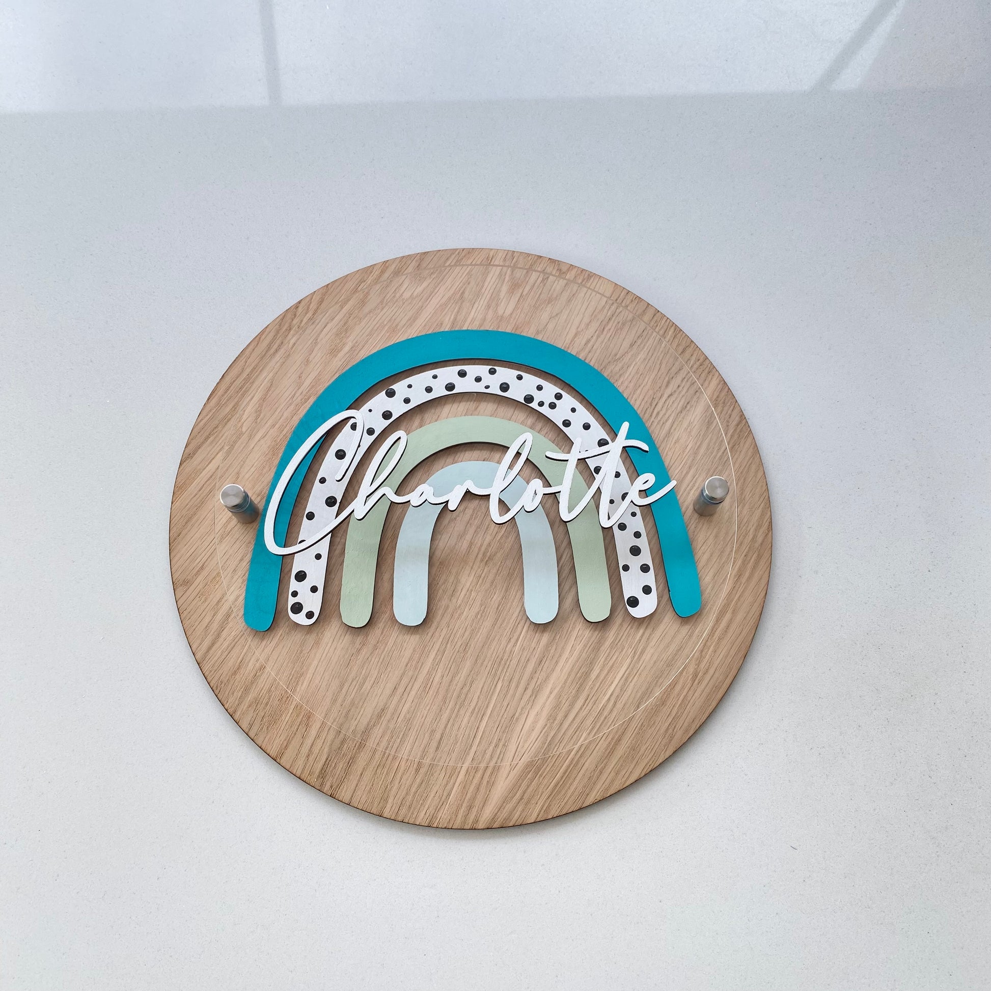 Made of 4mm oak veneer and 3mm acrylic, this 30cm round sign features a 3D hand-painted name and is easily mounted on your wall using standoffs.